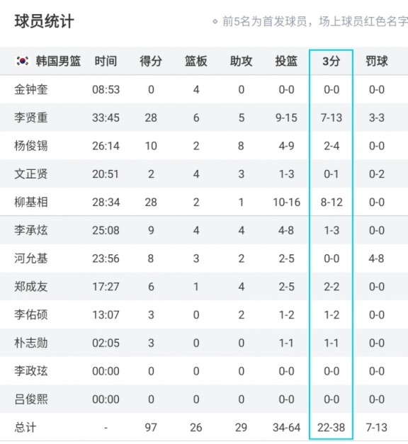 08月10日讯 亚洲杯A组小组赛,韩国仅用三节就命中17记三分球将比赛打花,最终韩国队全场命中22记三分并以97-86击败黎巴嫩。