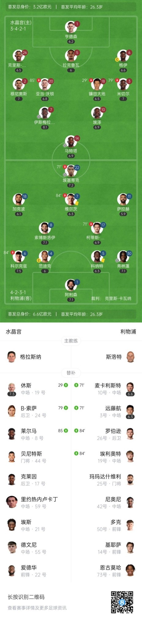 第4分钟,利物浦闪击得手!维尔茨左路横传给到埃基蒂克弧顶内切低射破门,水晶宫0-1利物浦。↓