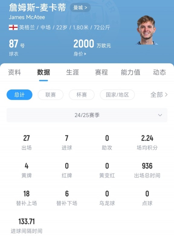 22岁的英格兰中场麦卡蒂,上赛季代表曼城出战27场比赛,打入7球,目前麦卡蒂的德转身价为2000万欧元。