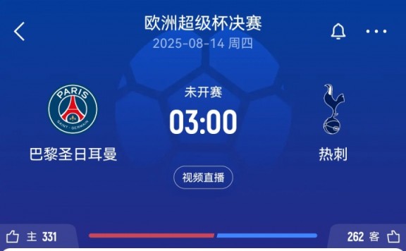 北京时间8月14日凌晨3点,上赛季欧冠冠军巴黎圣日耳曼,将在欧洲超级杯决赛中迎战欧联杯冠军托特纳姆热刺。